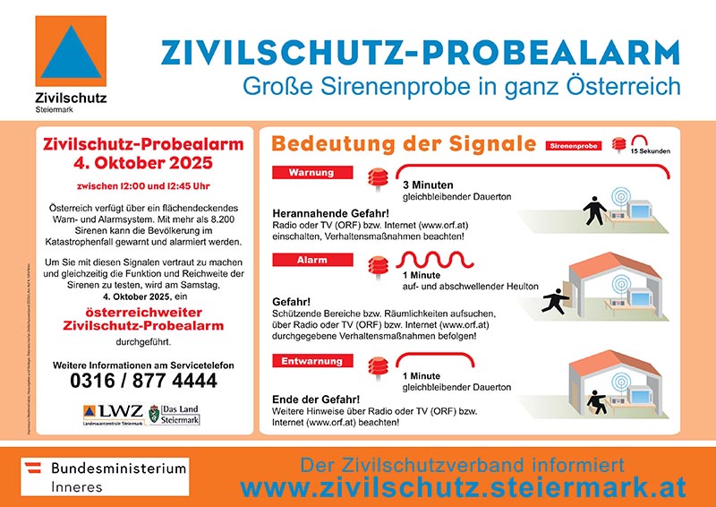 Am Samstag, 4. Oktober 2025, 12 bis 12.45 Uhr, findet der diesjährige Zivilschutz-Probealarm in ganz Österreich statt. Dabei werden die mehr als 8.000 Sirenen sowie AT-Alert ausgelöst. Der Probealarm dient einerseits zur Überprüfung der technischen Einrichtungen des Warn- und Alarmsystems, andererseits soll die Bevölkerung mit diesen Signalen und ihrer Bedeutung vertraut gemacht werden. Das Sicherheitsmanagement der Stadt Graz hat dazu ein Video herausgebraucht, in dem die Signale anschaulich erklärt werden. Klicken Sie hier für das Video!